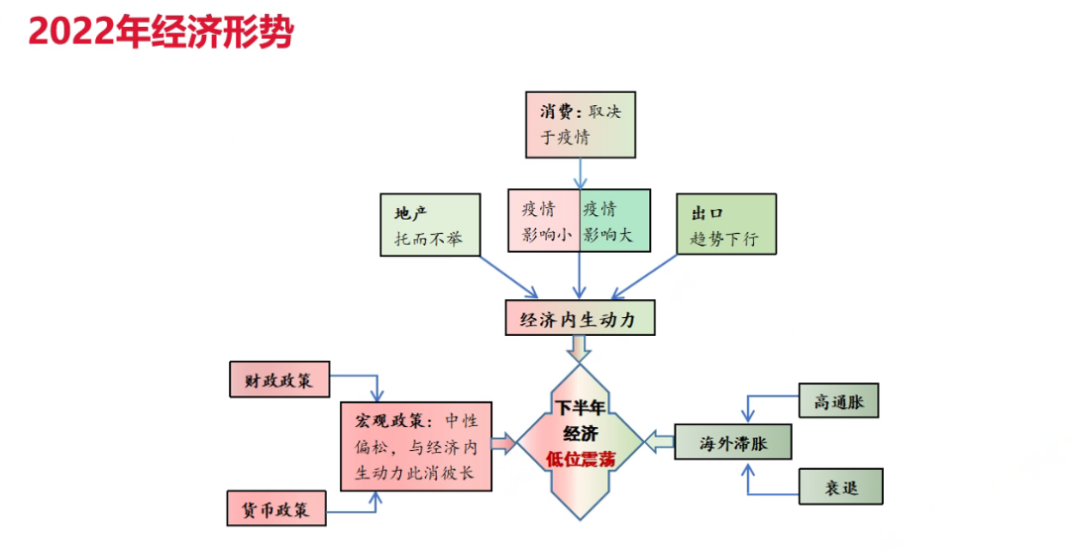 今年以来,几个主要的经济矛盾可以通过这张图表现出来。首先是大家讨论比较多的疫情影响,如果疫情影响大,会对经济产生明显的负向影响。然后是地产,整个地产面临很多的问题,目前来看地产投资处于相对弱势。最后是出口,出口近两年表现良好,但是今年将承受一定的压力。短期看压力并不明显,但是后期压力会逐渐显现。如果疫情影响持续,整个经济内生动力将会偏弱。因此,我们要有一个维稳的操作。正如去年经济工作会议以及今年4月29日的政治局会议上所讲,在这种情况下,财政、货币政策都需要宽松,这是市场和社会的共识。