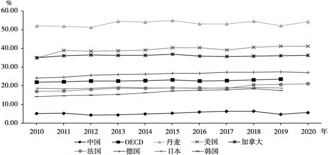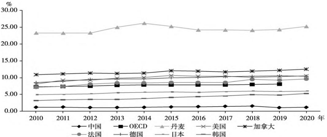 图4 2010-2020年中国和部分OECD国家个人所得税收入占GDP的比重