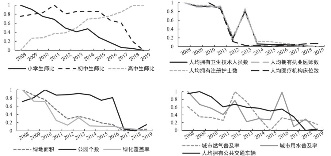 为观察基本公共服务均等化效果,我们选取了较有代表性的教育生师比、医疗卫生水平、公园绿地情况、城市公共设施指标,通过计算地区间基本公共服务变异系数来反映均等化程度。从教育生师比来看,地区间义务教育阶段的生师比差距呈明显下降趋势,说明地区间义务教育的均等化程度提高。从医疗卫生水平来看,无论是卫生技术人员数,还是医疗机构床位数,地区间变异系数逐年缩小,表明医疗卫生的均等化程度改善明显。从公园绿地情况来看,人均绿地面积、公园个数和绿化覆盖率的地区间差距逐年下降,说明地区间绿化设施的供给情况趋于优化。从城市公共设施来看,燃气普及率和用水普及率差距波动下降,公共交通车辆差距也明显下降,说明城市配套服务水平提高。综上,我国地区间基本公共服务供给差距大致呈现下降趋势,基本公共服务均等化的改善效果明显。