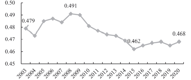 研究收入分配问题不可避免地聚焦于居民收入分配。衡量居民收入不平等的重要指标是基尼系数,该系数越大,则不平等程度越高。按照国际通用标准,基尼系数在0.3以下为最佳状态,在0.3—0.4之间为正常状态,超过0.4为警戒状态,我国基尼系数早在1994年就已超过警戒线水平。进入21世纪后,以2008年为分界,我国收入差距呈现先上升、后下降至基本稳定的趋势(李实等,2019)。数据上看,我国基尼系数在2008年达到峰值0.491,而后逐年下降,近两年略微抬头,截至2020年约为0.468。