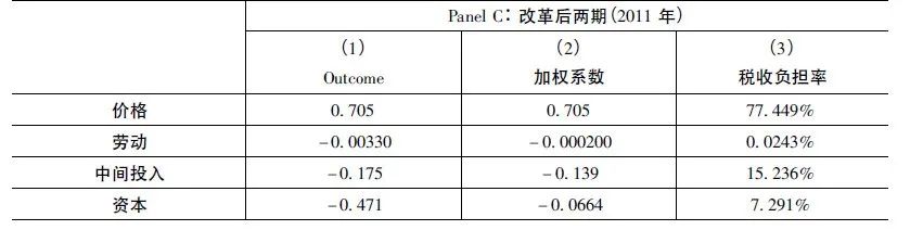 Panel B反映了改革一年后的税负转嫁情况。与改革前相比,矿产品价格增加了0.671,但平均劳动力成本降低了0.00230,中间投入成本下降了0.294,企业利润率降低了0.466,税率改革对企业的负面影响依然存在。与改革当期相比,滞后一期的平均劳动力成本、中间投入成本及企业利润率的下降幅度都有缩小,价格上涨幅度明显增加。企业员工、中间投入供应商、企业所有者的税收负担率分别为0.0159%、23.978%、6.777%,与改革当期相比均有下降。与此同时,下游企业(消费者)的税收负担率为69.230%,与改革当期相比明显上升。