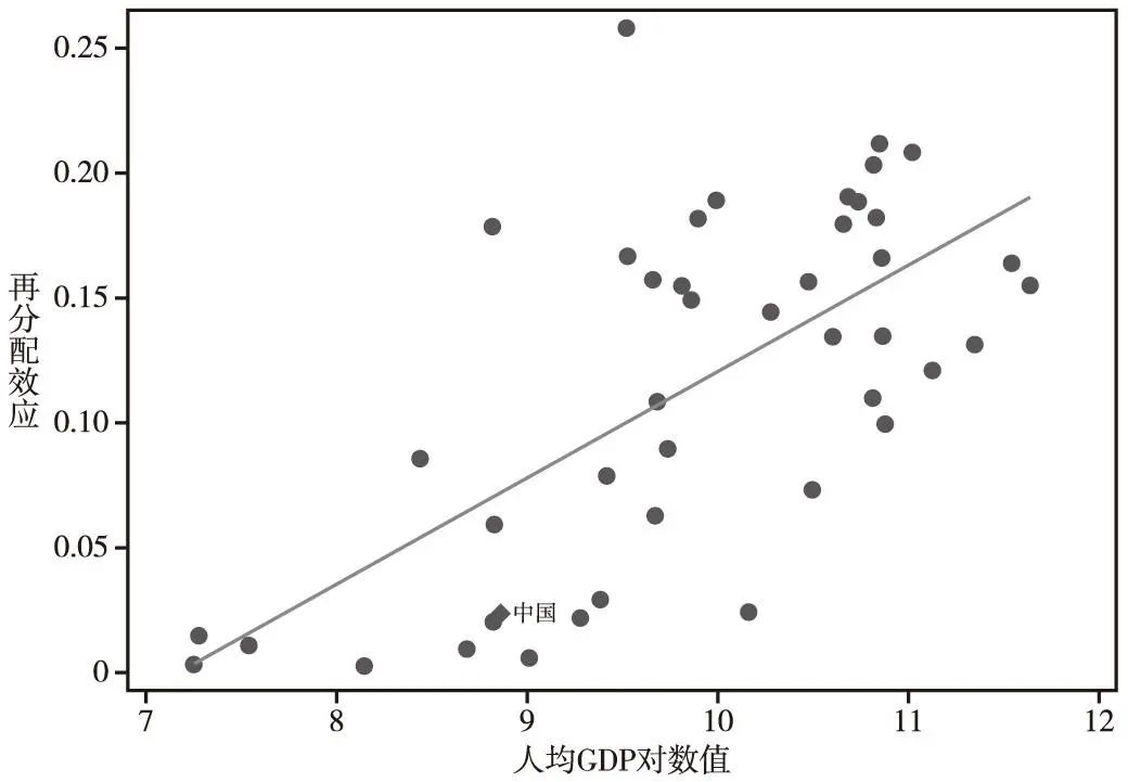 注:再分配效应由作者计算得到,人均GDP来自WDI数据库。