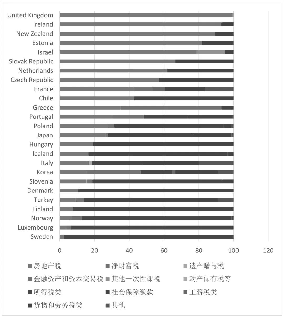图5显示的是2017年单一制国家中间层级和基层政府合计的收入结构,排序时按照房地产税占税收收入比重进行。占比超过90%的有英国(99.17%)、爱尔兰(93.07%);超过80%的有新西兰(89.36%)、爱沙尼亚(81.93%);超过50%的有以色列(78.83%)、斯洛伐克(66.57%)、荷兰(61.93%)和捷克(57.21%)。低于10%的有土耳其(9.27%)、芬兰(7.79%)、挪威(6.69%)、卢森堡(4.38%)和瑞典(2.36%)。其中,后四个国家中间层级和基层政府收入来源主要是所得税类。