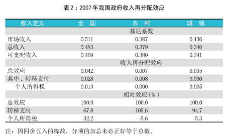 (一)基尼系数法衡量的收入分配效应。表1给出了2007年收入构成以及均值,表2给出了三种不同收入的基尼系数估计值以及两种政策工具的收入再分配效应。根据计算结果,可以看出 :(1)政府收入再分配政策对居民收入不平等具有调节作用。全国人均市场收入的基尼系数为0.511,这是用市场力量决定的我国居民收入的不平等程度 ;全国人均可支配收入的基尼系数为0.469,与人均市场收入基尼系数相比下降了0.042,通过政府的收入再分配政策,居民收入不平等程度下降了8.2% 。(2)转移支付政策较个人所得税和社会保障缴费的收入再分配效应更强。市场收入基尼系数与总收入基尼系数之差,是衡量转移支付的收入再分配效应强弱的尺度,而总收入与可支配收入在基尼系数上的差异则是衡量个人所得税和社保缴费效果强弱的指标。由表2可知,这两个数字分别是0.028和0.014。在收入再分配政策的总体效应中,二者的占比分别为67.8% 和32.2% 。(3)政府收入再分配政策在农村基本没有效力。在农村,与市场收入相比,可支配收入基尼系数下降0.007,收入不平等程度下降1.8% 。(4)政策的收入再分配效应在城镇表现的尤为突出。在城镇,与人均市场收入基尼系数的0.436相比,可支配收入的基尼系数为0.341,后者较前者低0.095,收入不平等程度下降了21.7% 。(5)转移支付和税收的收入再分配效果在农村和城镇之间具有显著的差异。在农村,总收入的基尼系数仅仅下降了0.008,这主要是数据所反映的2007年农村社会保障制度的缺失引起的 ;而与总收入相比,可支配收入的基尼系数略有上升,其原因在于农村的税负多对非农个体经营课征,而非农个体经营者本身并不是高收入人群。在城镇,来自转移支付和个人所得税的收入调节效应分别为0.09和0.005,占比分别为94.7% 和5.3% ,具有“提低”效应的转移性支出比具有“限高”效果的个人所得税更有效。