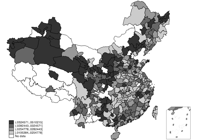 图2进一步以各城市与全国其他城市间市场分割为例,展示了2001—2015年间城市市场分割均值的地区分布情况。可以看出,东、中、西部地区在市场一体化进程方面存在明显差距。除数据所限而无法计算出市场分割指数的地区以外,平均而言,西部地区的地级市平均市场分割程度较高,中南部地区的市场整合程度相对较高。