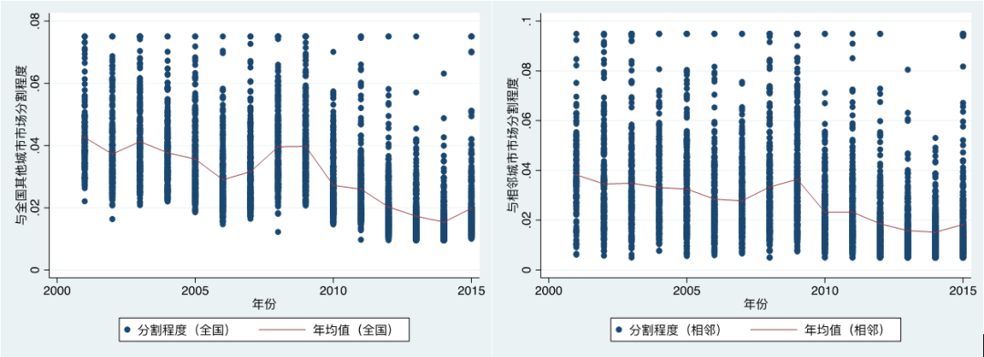 商品市场分割的测算以314个地级市在2001—2015年的非平衡面板数据为分析对象。原始数据来源于《中国城市统计年鉴》、《中国统计年鉴》。其中由于城市行政级别差异会影响地区间的可比性,因此剔除四个直辖市的数据。资本要素市场分割的测算是通过将1998—2013年的中国规模以上工业企业的数据加权平均到宏观地区-行业-年份层面,以地区对的行业间方差反映各地区的资本要素市场分割情况。其中,由于2010年的数据存在明显错误,未将2010年数据纳入分析样本。