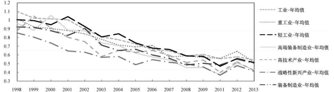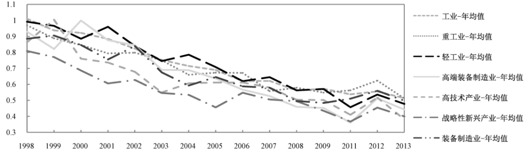 图3展示了全国资本要素市场分割程度整体变动趋势。整体来看,各行业资本市场均趋于整合。从各行业资本市场分割程度变化的时间节点来看,我国1998年实施积极财政政策在一定程度上加强了政府对市场的干预,高端装备制造业和高技术产业资本市场分割程度在此后1至2年呈现加剧态势,其余行业资本市场分割程度没有较为明显变化。自我国2001年加入世界贸易组织(WTO)后,各行业资本市场均呈现出较为明显的整合趋势,大部分行业市场分割程度下降超过0.2个单位。这在一定程度上表明,加入WTO有助于开放型经济的形成,相对完善了社会主义市场经济体制,有助于全国范围内资本市场的整合。这一结论与Li和Zhang(2003)认为加入WTO有助于消除地区间的贸易保护基本一致。2008年在我国出口需求受到全球金融危机冲击背景下,地方政府加大对国内本地市场的保护,第三阶段(2009—2013年)各行业市场一体化进程进入平台期,市场分割指数未呈现明显下降。