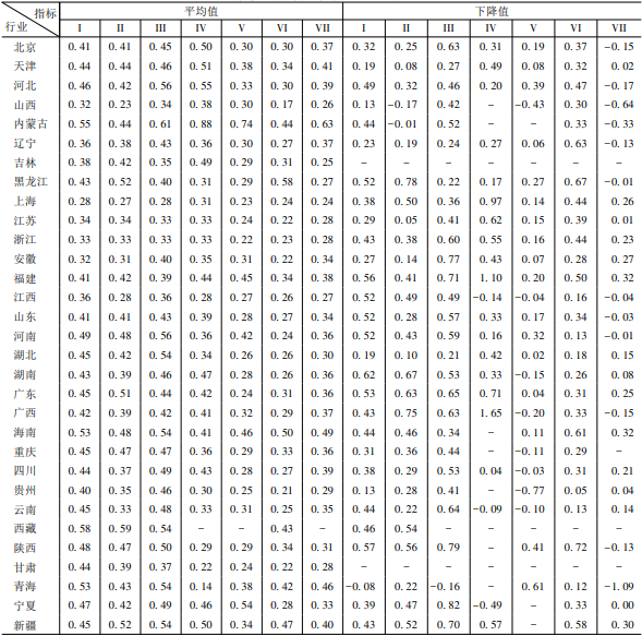 为进一步分析我国资本要素市场分割程度的区域分布特征,绘制各省(区、市)不同行业的省份间资本要素市场分割程度的平均值以及1998—2013年的下降值,如表1所示。整体来看,对行业I(工业)至行业VII(装备制造业),省份间市场分割程度的平均值分别处于0.28至0.58间、0.23至0.59间、0.28至0.61间、0.14至0.88间、0.22至0.74间、0.17至0.58间、0.24至0.63间。结合区域特征来看,市场分割程度较小的省(区、市)中,上海、江苏、浙江均属于东部沿海地区;反观市场分割程度较大的地区,多为经济发展水平相对较低的西部地区。另外,根据下降值部分列示的数据可知,2013年大多数地区市场分割程度相较于1998年有了较为明显的下降。另外,从行业资本市场分割程度的变化趋势来看,除高技术产业、装备制造业外,其余行业省份间资本要素市场基本呈现出整合的趋势。