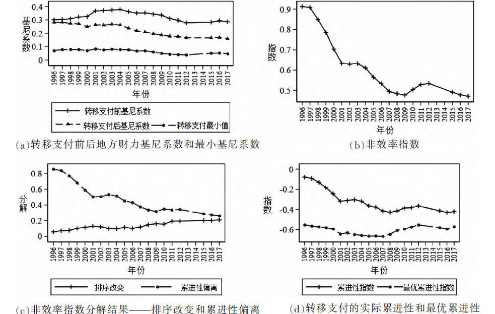 内容提要:本文考察了1994年之后中国转移支付的财力均等化效应,运用RE指数、基尼系数按收入构成分解、基尼系数路径曲线、非效率指数四种方法分析,结果显示,1994年分税制之后,转移支付具有显著的财力均等化效应。具体而言,无论是用RE指数衡量的总体效应,还是用基尼系数按收入构成分解评价的边际效用,2001年之前转移支付的财力均等化效应不断增强,其后基本处于稳定状态。非效率指数显示,转移支付在均衡地区间财力差距上的效率表现虽然处于不断改善的趋势中,但仍然不尽如人意,尚有较大的改善空间。具体而言,1996年转移支付在缩小地区间财力差距上仅实现其潜力(或最大值)的20%左右,即非效率指数值高达80%左右,2017年非效率指数下降到50%左右。非效率指数的分解结果显示,转移支付在均衡地区间财力差距方面之所以表现不佳,既有转移支付大规模地改变了各省份财力水平排序的原因,也有转移支付资金分配对落后省份倾斜不足的原因。
