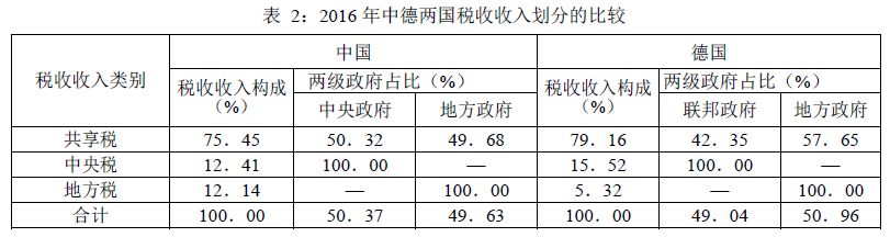 从税收收入划分来看,中德两国的税收集权化程度大体相同(表2)。无论是中国还是德国,共享税都占税收收入的绝大部分,中国75.45%,德国79.16%。虽然在共享税分配给中央政府的份额和地方税占税收收入的比重上,中国均高于德国,但最终全国税收收入中中央和地方政府所占的比重,两国情况基本相当。