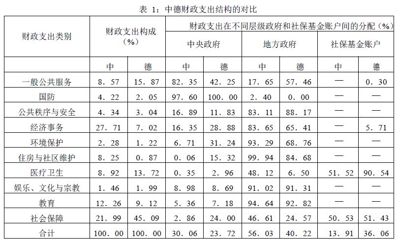 比较事权和支出责任划分的差异(表1)。德国财政支出中规模最大的前五项分别是社会保障、一般公共服务、医疗卫生、教育和经济事务,而我国财政支出规模最大的前五项分别是经济事务、社会保障、教育、医疗卫生和一般公共服务。我国财政支出中用于经济事务的比例偏高,而社会保障偏低。虽然两国社会保障支出的一半都来源于社保基金账户,但一般政府社会保障支出中由中央政府负担的比重,德国为24.0%,中国为2.86%,表明德国联邦政府在社会保障这项公共服务上所发挥的作用远远大于我国的中央政府。