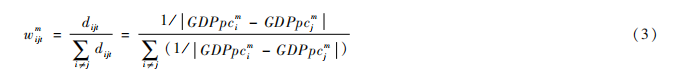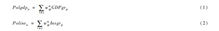 其中, 1.png 为j地区t时期的实际GDP增长率,Invgrjt为实际投资增长率。 1.png t时期j地区对i地区影响的权重,地区ij同属于省份m。由于晋升锦标赛主要在同省的城市间展开,在生成加权变量时,只考虑同一省份的城市间的相互影响。经济距离dijti地区与j地区间人均GDP差值的倒数 来衡量,并通过归一化处理构建权重 1.png