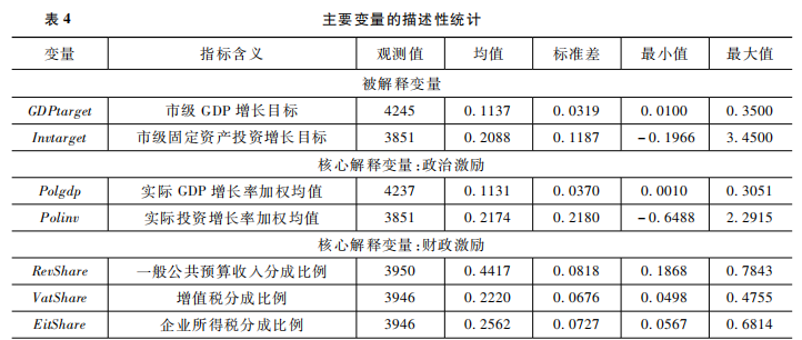 本文选取2000—2018年城市层面(包括地级市、地级区域和自治州)的面板数据,囿于数据可得性,收入分成数据为2000—2016年,其他变量的数据为2000—2018年。经济增长目标和固定资产投资目标数据整理自各省份和各市每年的《政府工作报告》,收入分成数据来自《中国税务年鉴》、《中国区域经济统计年鉴》和《全国地市县财政统计资料》,其他控制变量的数据来源于《中国城市统计年鉴》、《中国区域经济统计年鉴》和CEIC数据库。此外,在中国行政体制下,省会城市和计划单列市的市长和市委书记的行政级别多为副部级,这些城市与其他普通地级市之间不存在直接的晋升竞争关系,因而基准回归剔除省会城市和计划单列市样本。本文实证分析所用主要变量的描述性统计如表4所示。