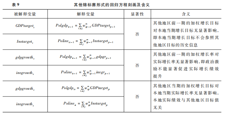 考虑到其他可能的锦标赛形式,分别替换了被解释变量和解释变量,构造不同回归方程,进行稳健性检验,以刻画其他地区政府行为是否会对当地的增长目标和实际增长率产生影响,具体的变量设置及含义如表9所示。其中,权重分别使用表3中所列的不同加权方式,回归结果依然稳健。