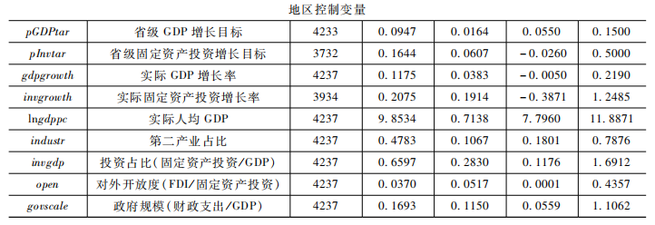 本文采用市级《政府工作报告》中的地方经济社会发展的预期目标数据度量地方政府的行为动机,主要采用GDP增长目标和固定资产投资增长目标。各级政府的《政府工作报告》中,关于每年地方经济社会发展目标的内容虽有所差异,但基本包括地区生产总值、固定资产投资、工业增加值、财政收入、城乡居民收入、物价和失业率等目标。其中,GDP和投资目标出现频率高且数据规范,较好地刻画了地方政府发展经济的动机。在政绩考核制度下,中国经济发展过程中贯穿着目标控制和目标管理,理性的地方政府和官员会充分地借助增长目标管理来实现本地经济增长,即综合权衡地方前期实际的经济运行情况和资源要素禀赋等因素后制定目标,再调动各方积极性努力完成目标,体现地方发展经济的动机和积极性。