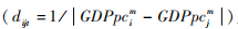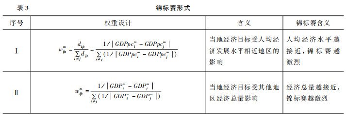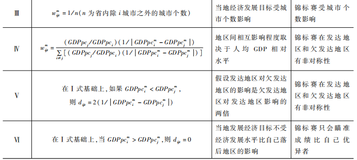 因而,本文采用其他地区实际增长率的加权均值来衡量政治激励的影响,该指标可以衡量其他地区前一期的实际增长业绩对当地当期的目标制定的影响程度,体现地方官员在制定目标时受到的政治激励。同时,各地区在展开晋升锦标赛竞争时,由于经济发展水平存在差异,地区间受到的相互影响程度不尽相同,经济发展水平相近的地区间相互影响更大,而经济发展水平差距大的地区间相互影响更小。为了刻画出不同地区影响的差异性,借鉴空间计量经济学中权重矩阵的思想,用地区间的经济距离对其他地区的经济增长率进行加权。