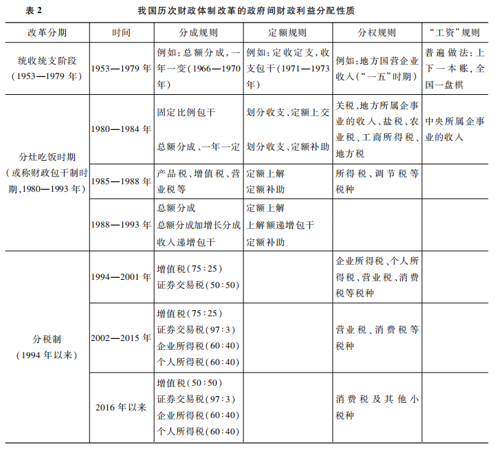 从规则形式的视角考察政府间财政收入分配关系的性质(见表2),可以发现,中央与地方政府间的税权配置可归纳为四种规则形式(吕冰洋,2009)。以改革开放和1994年为界,可将财政体制分为“统收统支”、“分灶吃饭”和“分税制”三个阶段历次重要财政体制变革的逻辑与出现的问题大部分可以用激励理论解释。