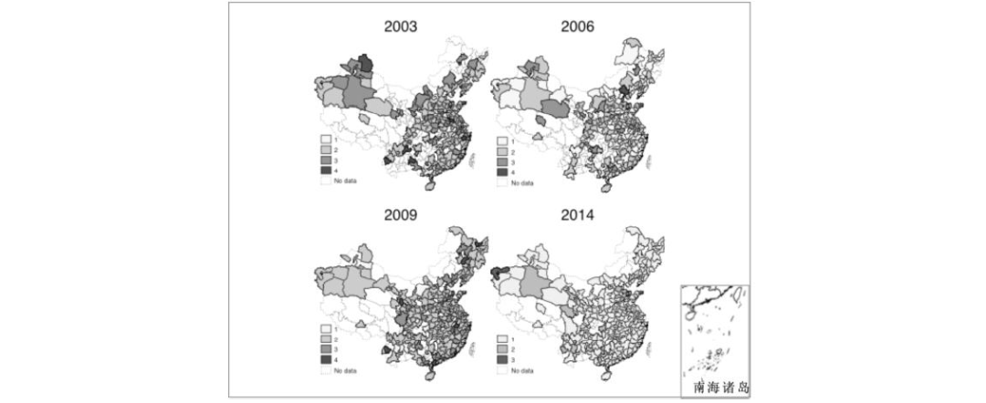 根据图1市场分割的变动趋势,在2001-2015年间,2003年和2009年对应市场分割程度较高的时点,2006年和2014年对应市场分割程度较低的时点。为了直观展示各城市市场分割程度的变化趋势,图3以2003,2006,2009和2014年为例,以0.025,0.05和0.075为临界点,由低到高对各城市的市场分割指数进行排序分组,反映年度间各城市市场分割程度的变化。总体上看,在2001年到2015年的市场化进程中各城市的相对关系基本稳定,排序的变动不大。除西部地区个别城市外,绝大部分地区的市场分割程度都在下降。