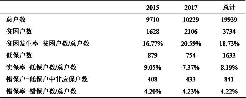 本文参考Ravallion反事实框架构建多维贫困标准识别模型,选取各村庄中与低保名额等量的、贫困概率最高的农户作为多维贫困户(即应保户),从而排除低保名额不足、低保户和贫困户识别标准不同的干扰。通过比较应保户与实保户,可以识别出错保与漏保情况。之后,本文分别在农户和村庄层面,探究经济精英和制度精英在低保名额分配和低保金发放过程中的精英俘获情况。其中,经济精英为村庄中收入较高的家庭,旨在探究收入不平等对精英俘获的影响;制度精英为含有村干部、乡镇干部的家庭,旨在探究“以权谋私”对精英俘获的影响。