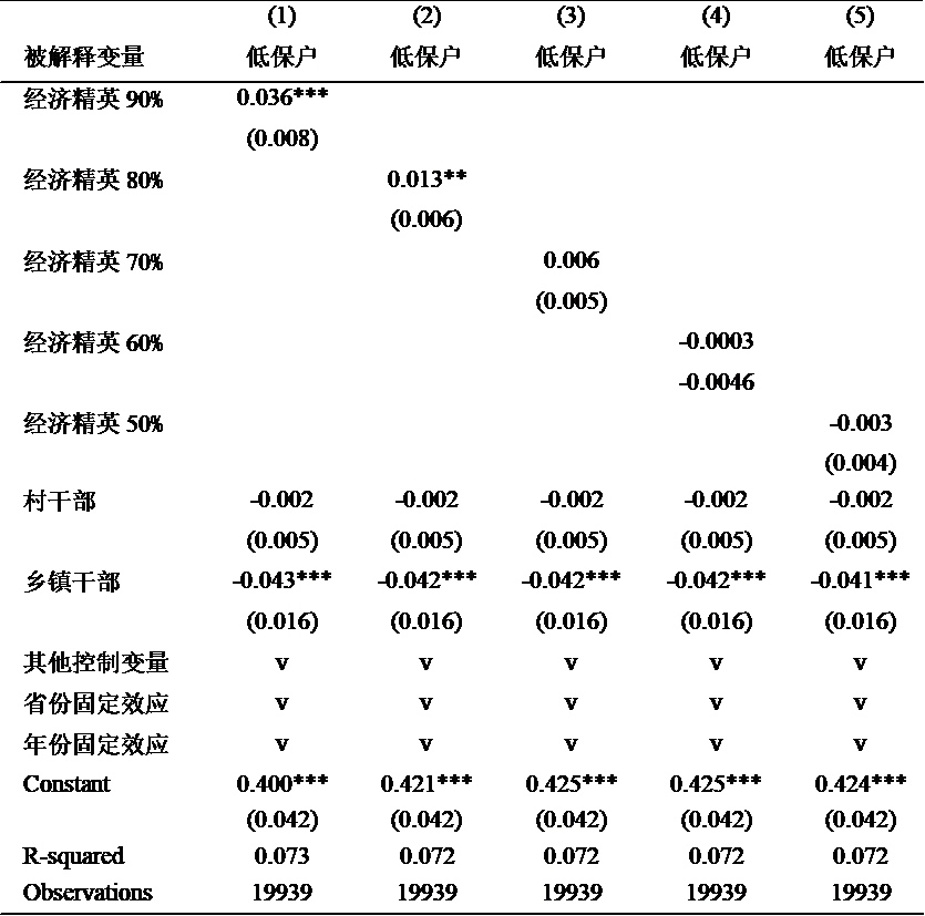 低保名额确定的回归结果如下,只有人均收入水平在村庄前90%和80%的经济精英系数显著为正,人均收入水平为村庄前60%和50%的经济精英对低保户的确定甚至有一定的副作用。其中,在其他条件不变的情况下,人均收入水平为村庄前90%的经济精英获得低保的可能性高大约3.62%,人均收入水平为村庄前80%的经济精英获得低保的可能性高大约1.31%。制度精英不太可能被认定为低保户,甚至乡镇干部的系数显著为负。