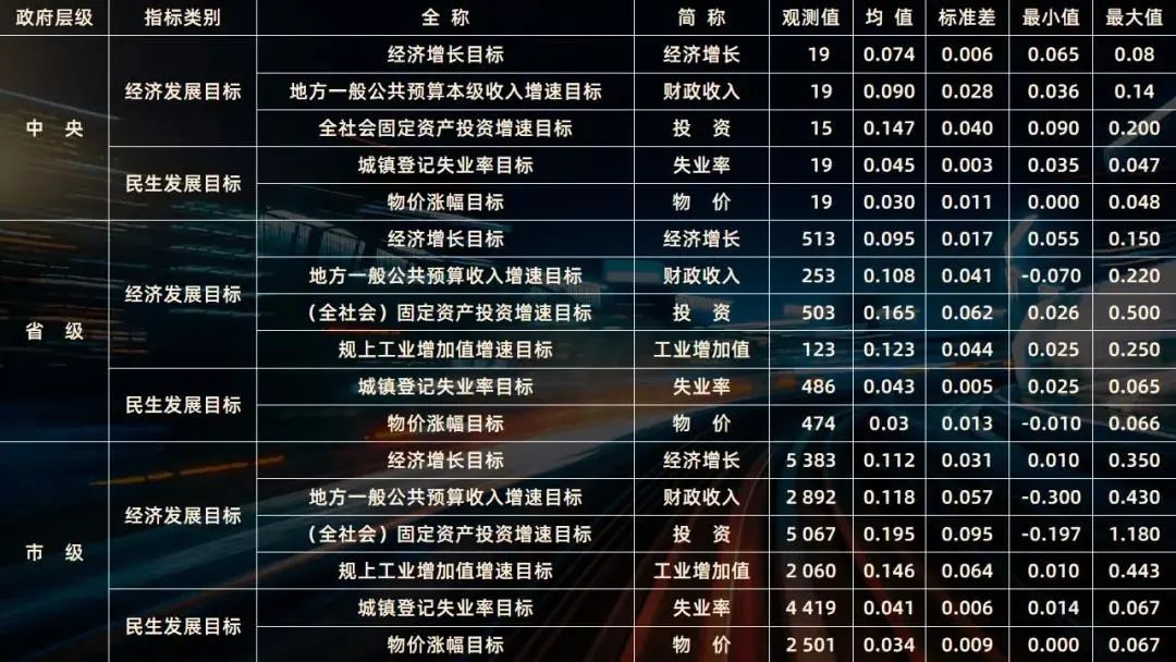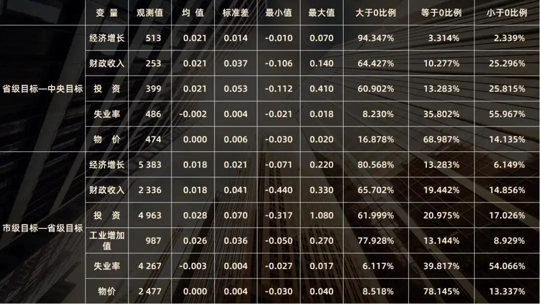 第一,保持目标的统计口径一致。就财政收入目标而言,报告中并非所有年份所有层级政府都公布这一口径(税收收入与非税收入之和)的目标,其他口径的目标还包括全口径财政收入增速目标、地方财政总收入增速目标、地方财政收入增速目标等(全口径财政收入也称大口径或境内或地域内财政收入,是该地实现的所有收入,包括地方一般(公共)预算收入、上划上级政府的税收收入、政府性基金收入、社保基金收入等。地方财政总收入也称地方一般公共预算总收入,包括地方一般(公共)预算收入、上划上级政府的税收收入。地方财政收入在各地的统计口径中有所不同,部分指代地方一般(公共)预算收入,部分指代地方一般(公共)预算收入与上级税收返还、转移支付之和,部分指代地方一般(公共)预算收入与政府性基金收入之和),为了保持各级政府财政收入口径一致,本文的地方一般公共预算收入增速目标包括报告中的一般公共预算收入增速目标、公共财政预算收入增速目标、财政预算收入目标、一般预算收入增速目标,这些指标虽然名称不同,但统计口径都是税收收入与非税收入之和。就失业率目标而言,虽然近年来有些市只公布城镇调查失业率目标,但为了保持口径一致,我们并未将其统计在内。就投资目标而言,中央一直公布的是全社会固定资产投资增速目标,而省、市两级政府公布的投资增速目标则包括全社会固定资产投资增速目标、固定资产投资增速目标、规模以上全社会固定资产投资增速目标、规模以上固定资产投资增速目标、城镇固定资产投资增速目标、技改投资增速目标、国有及其它经济类型单位固定资产投资增速目标等,严格来讲,全社会固定资产投资与固定资产投资并非同一口径,但是报告中两者交错公布,并且对于一些市而言,经过计算两者实际代表同一含义( 例如,2001年镇江市政府工作报告提出,2001年预期调控目标“全社会固定资产投资145亿元,增长3.6%”,对2000年回顾“固定资产投资140亿元”,经计算,145/140-1=0.036;2008年吉林市政府工作报告提出,“全社会固定资产投资完成905亿元,增长30.8%,其中工业项目投资完成560亿元,占固定资产投资总额的62%”,经计算,560/905=0.62),另外,固定资产投资指标本身就有统计起点标准,实际就是规模以上的概念,因此本文的(全社会)固定资产投资增速目标包括报告中的全社会固定资产投资增速目标、固定资产投资增速目标、规模以上全社会固定资产投资增速目标、规模以上固定资产投资增速目标。就工业增加值目标而言,有些地区公布的目标口径是全部工业增加值、工业总产值、规上工业总产值等指标,考虑到总产值与增加值的度量标准不一样,我们删掉这部分样本。