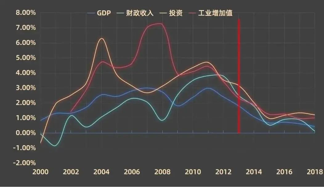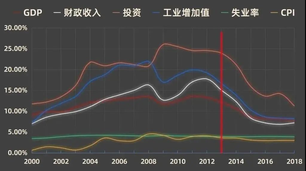 第一个阶段是2000—2012年,经济发展目标大体处于上升阶段。这一阶段初期,中国成功克服了亚洲金融危机的不利影响,初步建立了社会主义市场经济体制,具备了良好的发展基础,国家发展处于重要战略机遇期。在这一有利背景之下,各级政府努力发展经济,不断提高目标。2008年全球金融危机发生后,中国经济面临较大下行压力,2009年地方政府开始调低经济增长、财政收入和工业增加值目标,但是投资目标大幅度上升,这反映当时以“四万亿”投资刺激经济的背景。2009年后投资目标连续3年保持高位,这带动其他经济目标的上升。